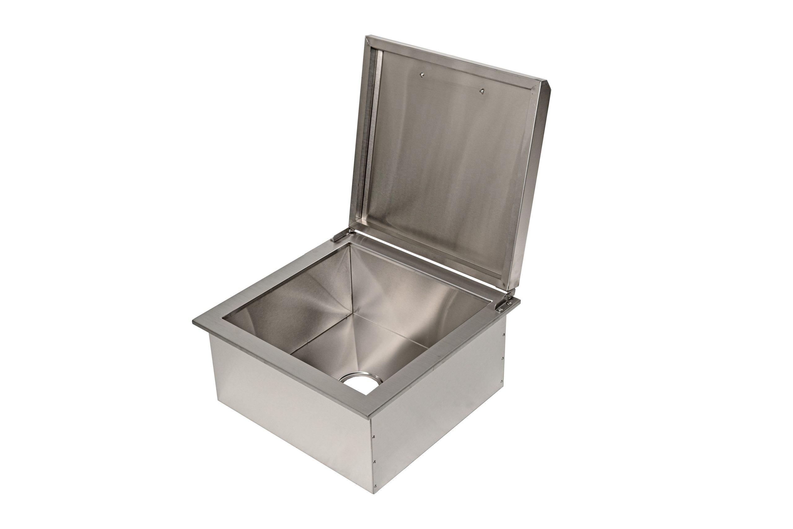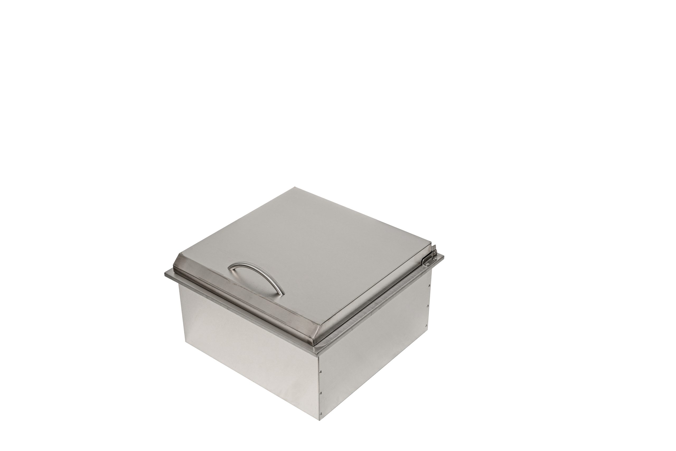 An 18" x 18" drop-in stainless steel ice chest designed for outdoor kitchens, featuring a drain and plug to keep food and beverages chilled.