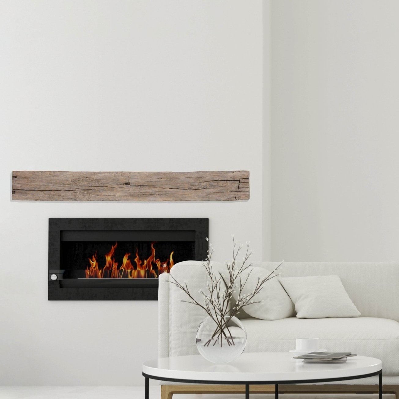 The Tobacco Barn mantel is molded directly from a 7.5” x 7.5” barn timber to authentically reproduce the beautiful seasoning imparted to the wood over time. Features include hand-hewn tool marks, deep checking, knots, and growth rings visible on the ends.