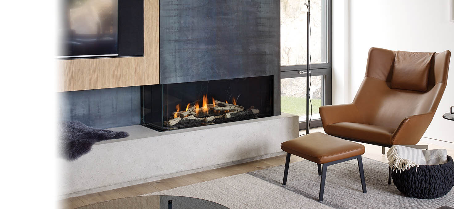 Medium fireplace with a 40″ linear burner. The clean uninterrupted view of the flame is enhanced with two sides of viewing and is zero clearance for design flexibility. Direct Vent and Power Vent available.