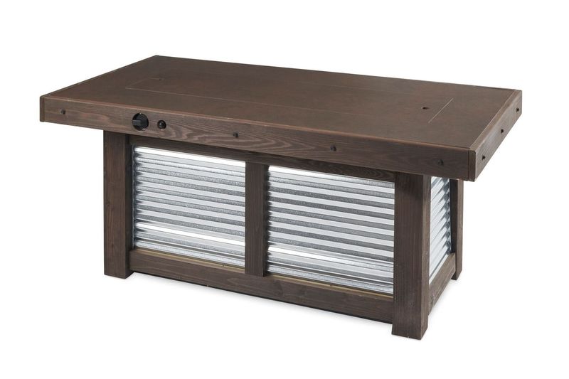The Denali Brew Gas Fire Pit Table is the ultimate cozy focal point for making memories. The Everblend™ concrete top complements the unique corrugated galvanized metal base. Mocha-stained wood frames the fire pit table for a complete wow factor. The Everblend top is unique to each fire table. Bottle opener on the fire table makes entertaining easy. Use the burner cover storage clips to conveniently store the cover when the burner is in use.